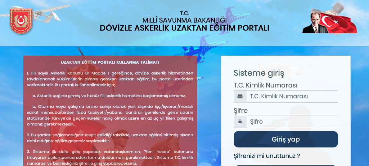 Yapılan duyuruda 1111 sayılı Askerlik Kanunu Ek Madde 1 gereğince, dövizle askerlik hizmetinden faydalanacak yükümlülerin alması gereken uzaktan eğitimin bu portal üzerinden verileceği kaydedildi. Açıklamada ayrca, yükümlülerin bu site üzerinden Milli Savunma Bakanlığı Dövizle Askerlik Uzaktan Eğitim Portalına giriş yapabilecekleri belirtilirken, uzaktan eğitim programını tamamlayan yükümlü vatandaşların; kanunda belirtilen belgelerle birlikte bağlı bulundukları konsolosluk ve/veya Büyükelçiliklere müracaat ederek dövizle askerlik hizmetini tamamlamış olacakları ifade edildi.