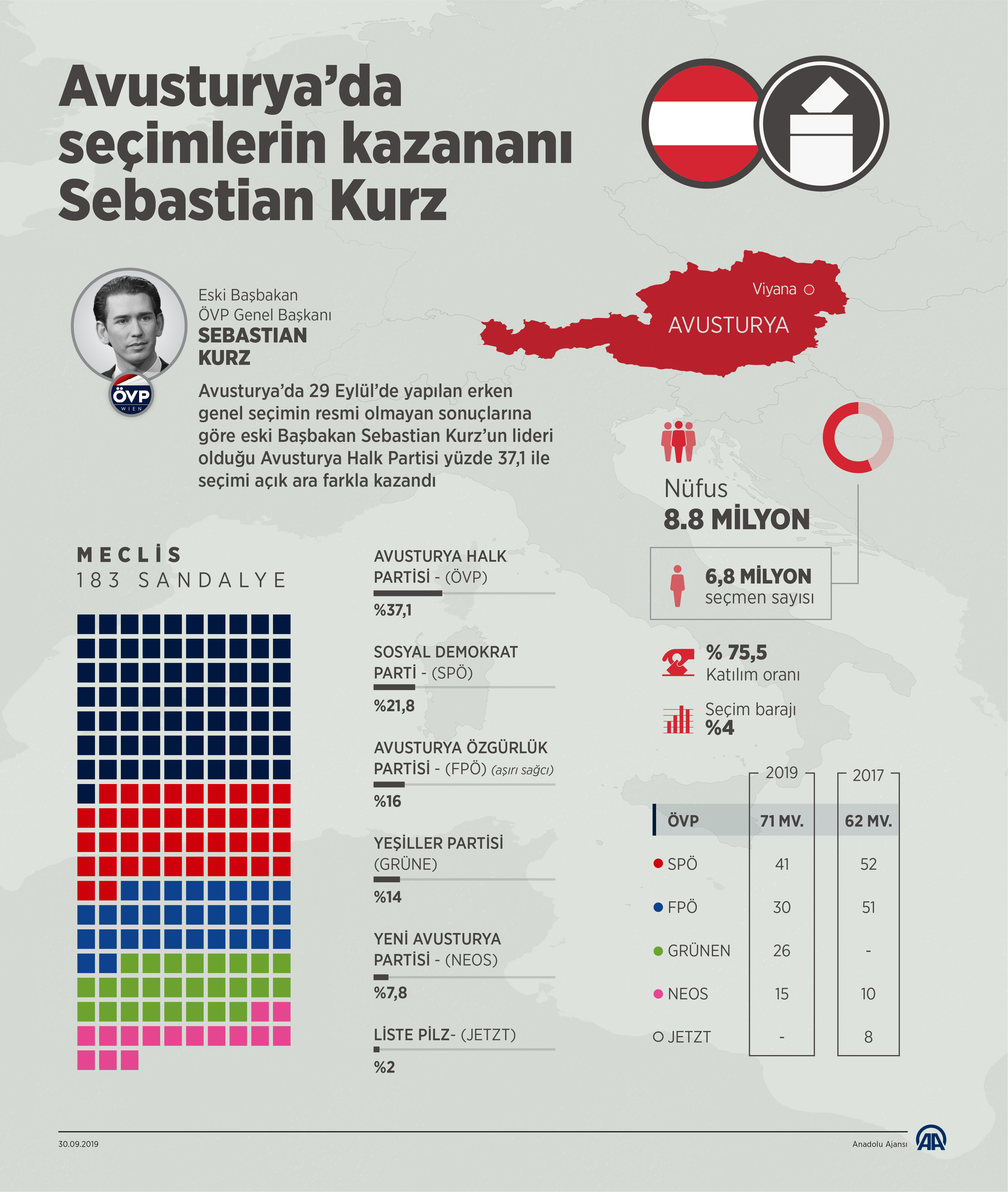 Yaklaşık 6,4 milyon seçmenin bulunduğu ülkede, seçmenlerin yüzde 75,5’i sandığa gitti. Avusturya Devlet Televizyonu ORF’nin yayımladığı sandık çıkış anketine göre, merkez sağ ÖVP yüzde 37,1 oranında oy alırken, Sosyal Demokrat Parti (SPÖ) yüzde 21,8, aşırı sağcı Özgürlük Partisi (FPÖ) ise yüzde 16 oranında oy elde etti. Geçen seçimlerde meclis dışında kalan Yeşiller Partisi ise yüzde 14 oy oranıyla yeniden meclise girmeye hak kazanırken, liberal Yeni Avusturya Partisi (NEOS) oylarını 2 puanın üzerinde artırarak yüzde 7,8’e çıkardı.
