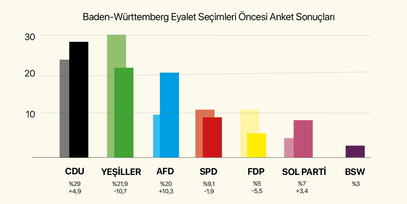 8 Mart’ta gerçekleşecek seçimler öncesinde Yeşiller, Kretschmann sonrası dönemde, özellikle iklim ve çevre politikalarındaki başarılarını koruma ve eyaletin ekonomik gücünü sürdürülebilir bir geleceğe taşıma vaadiyle seçmen karşısına çıkıyor. Diğer yandan, geleneksel olarak eyaletin en güçlü partisi olan Hristiyan Demokrat Birliği (CDU), bu liderlik boşluğunu kendi lehine çevirerek iktidarı geri alma ve eyaletin sanayi kimliğini yeniden merkeze koyma stratejisi izliyor.