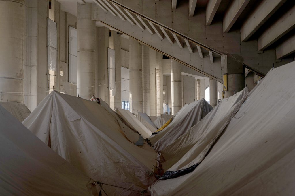 İsrail ordusu, Lübnan başkenti Beyrut’taki Dahiye bölgesine yönelik hava saldırılarını sürdürüyor. Saldırılar nedeniyle evlerini terk etmek zorunda kalan halk, yanlarına alabildikleri eşyalarıyla birlikte boş depoların içine çadır kurarak sığındı. 12 Mart 2026. | Fotoğraf: Alfredo Zuniga – AA.